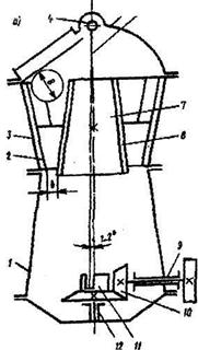 неподвижным 2 и подвижным — дробящим V. Первый закреплен к основанию дробилки 1. Дробящий конус плотно насажен на вал 6, верхний конец которого шарнирно с помощью подвесного подшипника 4 крепится к траверсе 5, а нижний — свободно входит в стакан-эксцентрик 11. Последний может вращаться в вертикальном подшипнике 12 станины дробилки. Вращение стакану-эксцентрику передается от электродвигателя через горизонтальный вал 9 и коническую передачу 70. Дробящие конусы бронированы плитами 3 и 8 из износостойкой стали. Геометрические оси подвижного и неподвижного конусов образуют угол до 2...3. При вращении эксцентрикового стакана геометрическая ось подвижного конуса описывает коническую поверхность с вершиной в точке подвеса вала, а сам конус совершает круговые качания внутри неподвижного Дробление материала происходит в зоне, где поверхности конусов сближаются, а разгрузка -там, где эти поверхности расходятся, г Максимальная крупность кусков, загруженных в дробилку при В = 900, 1200 и 1500мм, составляет соответственно 750, 1000 и 1200мм, а ширина разгрузочной щели — 125...225 мм.