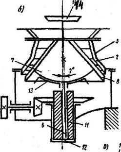 В таких дробилках иначе выполнена опора дробящего конуса. Вал б (рис. 10.3,6), на котором насажен дробящий конус, выполнен консольным, не имеющим верхней опоры. Если у дробилок для крупного дробления дробящий конус шарнирно подвешен к траверсе, то у дробилок для среднего и мелкого дробления опора дробящего конуса расположена в центре его качания и выполнена в виде сферического