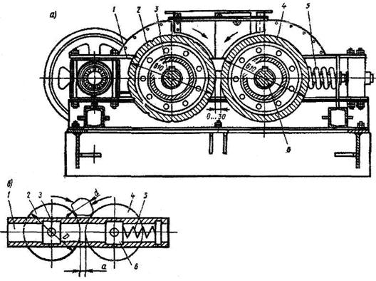 являются два параллельных цилиндрических валка 2 и 4, вращающиеся навстречу один другому. Попадающий в рабочую зону кусок материала увлекается трением о поверхность валков и затягивается в рабочее пространство, где подвергается дроблению в результате раскалывания, излома и истирания. Поверхности валков изготовляют гладкими и рифлеными. Валки монтируются на станине 1 в подшипниках 3 и 6. Подшипники одного либо двух валков имеют пружинные опоры 5, которые могут перемещаться в направляющих при попадании в дробилку не дробимого предмета. Вращение валка сообщается от электродвигателя через клиноременную передачу с частотой 75... 190 мин"1. Наибольший размер куска материала, загружаемого в дробилку, зависит от угла захвата, определяемого диаметром валков и коэффициентом трения о металлическую поверхность валков. Для возможности захвата гладкими валками исходного продукта в зоне дробления необходимо, чтобы угол захвата валков не превышал угол трения материала о поверхность валков. Максимальный размер кусков зависит от диаметра валков и размера разгрузочной щели. Для выполнения этих условий диаметр гладкого валка в 20 раз должен превосходить размер камня, а при рифленых поверхностях валков — в 12 раз. Поэтому валковые дробилки применяют только для вторичного