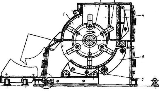 Роторные и молотковые дробилки. Роторные дробилки применяют для дробления известняка, доломита, руд, мрамора и других подобных им материалов, обладающих малой абразивностыо. Их выпускают двух типов: для крупного дробления, которые используют на первичной стадии дробления; для среднего и мелкого дробления, используемые на заключительных стадиях дробления. Работа таких дробилок основана на принципе разрушения пород ударными нагрузками. Роторные дробилки обеспечивают получение щебня высокого качества, преимущественно кубообразной формы, с одновременным обогащением продукта дробления, так как более слабые составляющие пород подвергаются значительному измельчению и отсеиванию от основных фракций. Роторная дробилка представляет собой коробчатый корпус 3,. в котором размещены вращающийся с большой скоростью ротор 1 с жестко закрепленными на его внешней поверхности билами 2. Вращение ротору сообщается от электродвигателя через клиноременную передачу. Внутри корпуса подвешены отражательные плиты 4 и 7, нижняя часть которых опирается на пружинно-регулировочное устройство 5 и 6, позволяющее регулировать ширину выходной щели, а также пропускать не дробимое тело при его попадании в камеру дробления. Дробление материала осуществляется в результате удара по нему бил и удара кусков об отражательные плиты, чем достигается высокая (10...20) степень дробления. В сравнении с другими типами дробилок роторные дробилки имеют меньшую металлоемкость, небольшие габариты, что в сочетании с высокой степенью дробления обусловило применение их в передвижных дробильных установках. Размер наибольшего куска, загружаемого в дробилки крупного дробления, 800... 1000 мм, среднего — 400...600 мм при окружной скорости 20...35 м/с.
