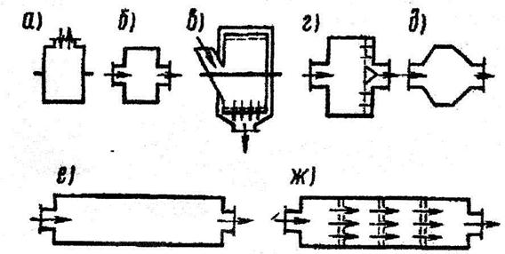Значение измельчения в экономике страны весьма большое. Это становится очевидным, если учесть, что измельчению подвергаются сотни миллионов тонн сырья (в основном в цементной и горнорудной промышленности). Между тем техника помола находится на низкой ступени. Энергия, расходуемая непосредственно на помол, составляет менее 1 % от израсходованной, а остальная теряется в виде тепла, звука и т. д. Поэтому любой прогресс в этой еще очень эмпирической области может явиться источником значительной экономии. Все существующие типы шаровых и трубных мельниц могут быть классифицированы по следующим основным признакам: по принципу работы — на периодические (рис. 10.25, а) и непрерывно, действующие (рис. 10.25 б, в, г, д, е, ж);