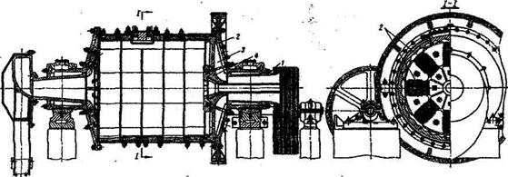 конического днища 1 с углом у вершины около 120° и полой цапфы 2 для загрузи породы, цилиндрической части 3 длиной 0,25—0,8 диаметра, конической части 4 углом у вершины в 60° и с разгрузочной полой цапфой 6.