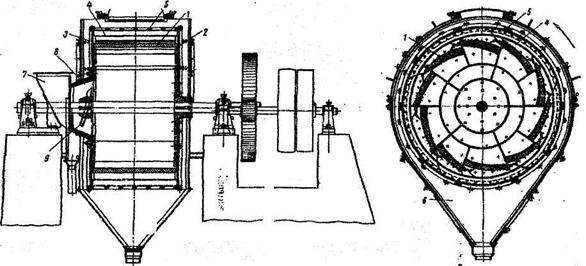 предохраняет от чрезмерной нагрузки и преждевременного износа наружное сито 5, имеющее отверстия, величина которых определяется требуемой тонкостью помола. Частицы материала, не прошедшие через наружное сито возвращаются для повторного измельчения в барабан через щели во внутреннем сите между плитами. Размолотый материал собирается в нижней части кожуха 6, который охватывает барабан мельницы. Материал поступает через загрузочную воронку 7 цапфу 8. Последняя имеет внутри направляющие лопасти 9, с помощью которого материал подается в мельницу.