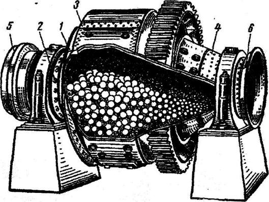 На рис. 10.35 показан общий вид двухкамерной трубной мельницы размером 3,2Х 15 в с центральным приводом. Эти мельницы предусмотрены как для мокрого, так и дл сухого помола и могут работать как в открытом, так и в замкнутом циклах. На рис. 10.36 представлен разрез мельницы (без приводного устройства). Принцип работы мельницы сводится к следующему: материал, подлежащий измельчению, при посредстве дозаторов подается в приемную воронку 1 и через питатель 2 в трубошнек 3, установленный в полой цапфе загрузочного днища 4, и далее в первую камеру мельницы. По мере измельчения материал продвигается к межкамерной перегородке 5 и через щели в ней, а затем через отверстия 6 поступает в сборный кожух 7 Собирается в нижней его части, откуда при посредстве элеватора подается в сепараторы.