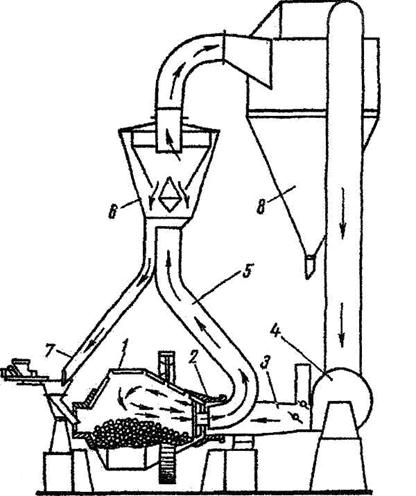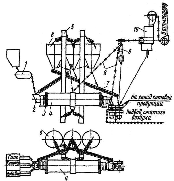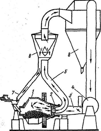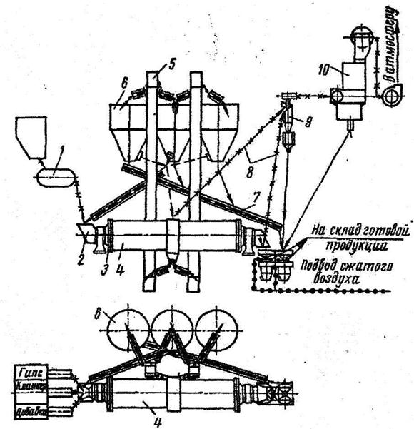 Материал из бункера весовым ленточным дозатором 1 подается в приемную воронку 2 и через загрузочное днище 3 в барабан 4. По выходе из первой камеры, как указывалось ранее, материал поступает по аэрожелобам в элеваторы 5 и затем подается в сепараторы 6. Готовый продукт из сепараторов при посредстве аэрожелоба 7 направляется к пневматическим камерным насосам, а крупка поступает на последующий домол во вторую камеру мельницы через воронку 8 сборника 7 (см. рис. 10.36) или в случае необходимости частично в приемную воронку 2 (рис. 10.38). Запыленный аспирационный воздух, отсасываемый из мельницы, направляется по трубопроводам 8 в