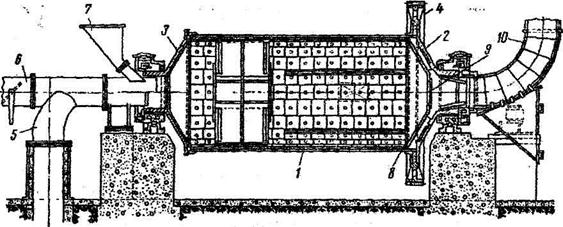 На цементных заводах для подсушки и размола угля, сжигаемого во вращающихся печах, применяются однокамерные мельницы, работающие в комплекте с сепараторами. Сварной барабан 1 мельницы (рис. 10.34) имеет литые конические днища 2 и 3 с цапфами, опирающимися на подшипники. Во вращение барабан приводится от привода через венцовую зубчатую шестерню 4. У загрузочного конца барабан мельницы радиальными перегородками разделен на пять секций длиной по 1 м. Поступающий в мельницу уголь попадает в секции, в которых интенсивно омывается