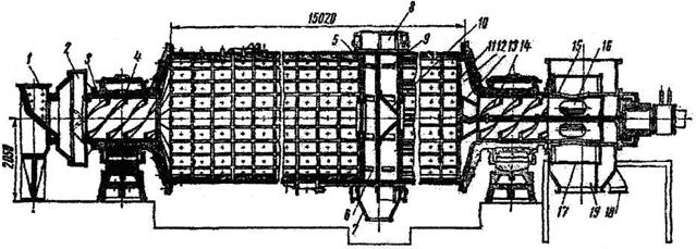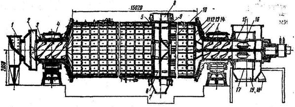 непрерывно аспируют путем отсоса из нее нагретого запыленного воздуха, который затем очищается в циклонах и фильтрах. В случае необходимости рассматриваемая мельница может быть приспособлена для работы по открытому циклу. С указанной целью отверстия 6 закрываются крышками и материал направляется через отверстия в перегородке 5 во вторую половину кожуха откуда посредством лопастей 9 и конуса 10 направляется во вторую камеру. По мере измельчения материал выходит из мельницы через отверстия в решетке 11 и с помощью радиальных лопастей 12 и конуса 13 направляется в полую цапфу 14 разгрузочного устройства. Далее готовый материал поступает в разгрузочный патрубок 15 и затем через окна 16 падает на сито 17. Раздробленные мелющие тела задерживаются на сите и отводятся затем по патрубку 18, а готовый цемент через патрубок 19 направляется к месту складирования. Пустотелый цилиндрический барабан мельницы изготавливается из стальные листов, соединенных между собой сваркой. Внутренняя поверхность барабан облицована футеровочными бронеплитами, отлитыми из марганцовистой стали или и отбеленного чугуна. С торцов корпус закрыт литыми стальными днищами