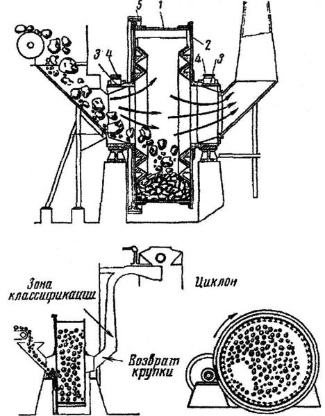 осаждается в циклоне 8. Воздух в циклоне, освобождаясь от измельченного материала, подается вентилятором через сопло в коническую мельницу.