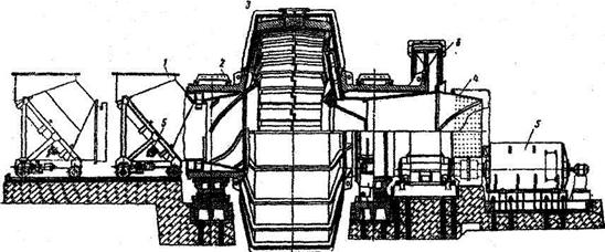 Сызранский завод тяжелого машиностроения изготовил промышленную мельницу диаметром 7,2 м для мокрого измельчения, работающую в замкнутом цикле с классифицирующими аппаратам. Материал в мельницу (рис. 10.40) загружается при помощи питателя 1 с вибратором 2 через пустотелую цапфу поступает в барабан 3. Куски материала специальным лифтерами, а также за счет центробежной силы инерции поднимаются при вращении барабана и затем, падая и соударяясь друг с другом и с футеровкой, разрушаются измельченный продукт проходит через разгрузочную цапфу в барабанный конический грохот 4.