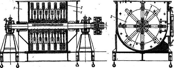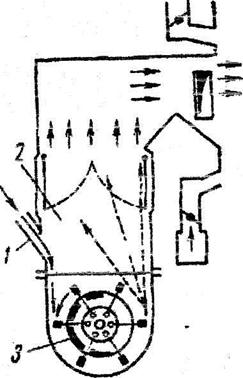 За последние годы в промышленности строительных материалов все большее применение находят так называемые шахтные мельницы. Подлежащий измельчению материал подается по трубе 1 (рис. 10.41) в шахту 2, установленную над мельницей. Материал вводится в помольную камеру по направлению вращения ротора 5, при этом готовые мелкие фракции, всегда имеющиеся в измельченном материале, подхватываются потоком газов, поступающих в корпус по специальным приемным каналам 1 (см. рис. 10.42). Частицы материала, измельчающиеся ударами бил 2, при этом подсушиваются. Процесс сушки в основном заканчивается в мельнице. Подсушенные и измельченные частицы по ступают в шахту, в которой отвеиваются под действием гравитационных сил. Частицы, скорость витания которых менее скорости потока,