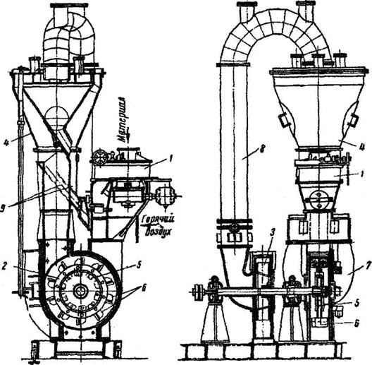 уносятся в осадительные устройства, где собирается готовый продукт. Частицы же, для которых скорость потока недостаточна, выпадают из него и поступают обратно в мельницу для домола. Таким образом, шахта выполняет роль сепаратора. При изменении скорости воздуха в шахте изменяется также тонкость помола. С уменьшением скорости воздуха тонкость помола повышается и, наоборот. Как отмечалось ранее, молотковые мельницы рассмотренной конструкции применяются также для одновременной сушки и помола различных материалов, а также для совмещенного обжига (дегидратации) и помола гипса. В указанном случае к корпусу мельницы подводятся от специального подтопка горячие газы с температурой до 300—400°.