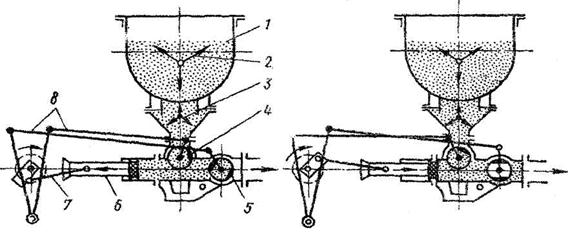 5 - клапан нагнетания; 6 - поршень; 7 - кривошипно-шатунный механизм привода поршня; 8 - рычаги управления клапанами.
