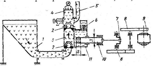 до 15м по вертикали целесообразно применять насосы производительностью 2 м3/ч, а на расстояние 100—125 м по горизонтали и 30—40 м по вертикали — производительностью 4 и 6м /ч По способ7 воздействия плнжеа на аство1 аствоонасосы можно разделить на: диафрагмовые, в которых действие плунжера. Передается на раствор через промежуточную жидкость, что предохраняет плунжер от абразивного износа; бездиафрагмовые, в которых плунжер соприкасается с раствором. В основном применяют диафрагмовые растворонасосы. Плунжер насоса (рис. 11.26) приводится в движение электродвигателем через зубчатую передачу и кривошипный механизм. Перемещение плунжера в камере, заполненной водой, создает давление в камере, в результате чего выгибается диафрагма, установленная между7 рабочей полостью насоса и камерой с водой. Находящийся в рабочей камере раствор приподнимает верхний шаровой клапан и раствор поступает в воздушный колпак. При обратном ходе плунжера диафрагма выгибается в сторону водяной камеры. В рабочей камере создается вакуум, верхний клапан закрывает отверстие под действием собственной массы, нижний клапан открывается под действием вакуума и раствор из бункера поступает в рабочую камеру. Подача раствора из рабочей камеры в воздушный колпак происходит порциями, а из колпака в трубопровод раствор подается непрерывно, так как объем воздушного колпака значительно больше, чем порция, подаваемая за один ход плунжера.