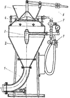 Для подачи бетона по трубам применяют пневматические бетононасосы, в которых бетон транспортируется по трубам при помощи сжатого воздуха. Резервуар (рис. 10.18) заполняется бетоном, после чего он герметически закрывается и в него подается сжатый воздух под давлением 5—6 атм. (0,5—0,6 МПа). Воздух выдавливает бетон в трубопровод, по которому он направляется к месту укладки. Так как поверхность бетона в резервуаре, на которую давит воздух, значительно больше, чем площадь сечения трубопровода, то давление в трубопроводе превышает 5—6 атм. (0,5— 0,6 МПа). В месте разгрузки бетонной смеси обычно устанавливается разгрузочный бункер, в котором смесь освобождается от воздуха.
