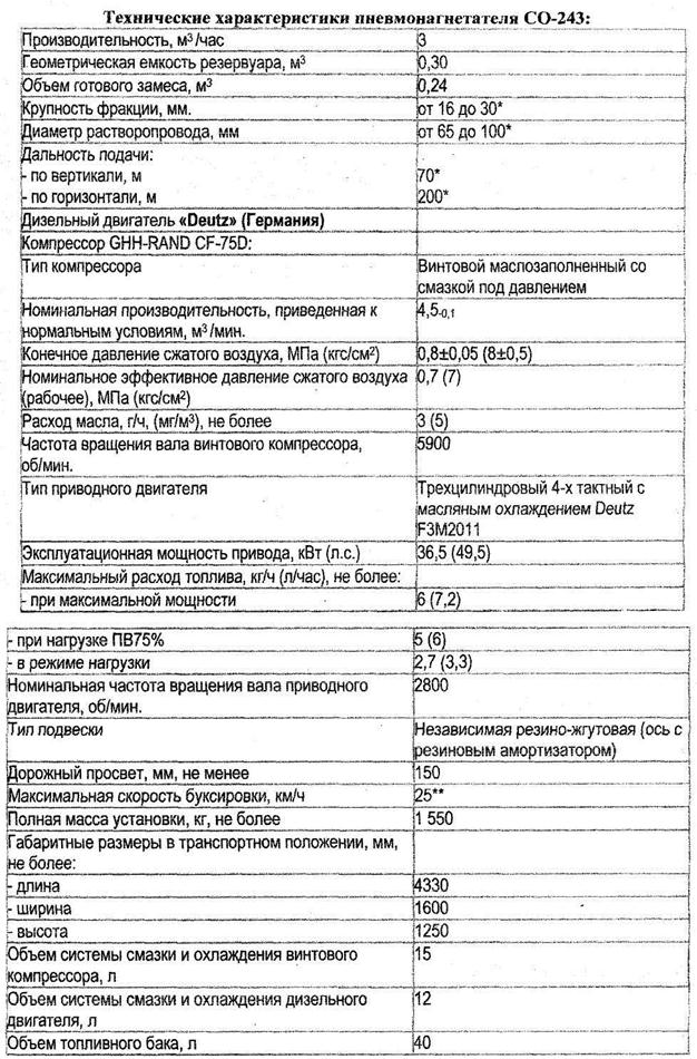 Пневмонагнетатель применяется на открытых площадках объектов промышленного, гражданского и сельского строительства, обеспеченных водой, Климатическое исполнение — У; категория размещения 1 по ГОСТ 15150-69 при температуре окружающей среды от плюс 5 до плюс 40 °С. Расположен на пневмоходу и оборудован дышлом, что обеспечивает мобильность и позволяет перемещать его по строительной площадке без использования специальной грузоподъёмной техники. Пневмонагнетатель комплектуется дизельным двигателем фирмы «Deutz» (Германия), винтовым компрессором CF-75D (Германия) производительностью 4,5м. куб./мин. и одним резервуаром-смесителем объёмом 300л., это позволяет использовать данную машину не только по её прямому назначению, но и как источник сжатого воздуха и подключать к ней различный пневмоинструмент (отбойный молоток, пневмотрамбовки, и т. п.). При этом в ПН-243 использован гидравлический привод бетоносмесителя через высокомоментный радиально-поршневой