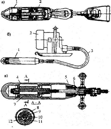 Глубинные вибраторы применяют при бетонировании крупногабаритных или густо насыщенных арматурой железобетонных конструкций (фундаментов, стен, массивных плит, колонн, свай и т. п.). Их также используют при стендовом способе производства железобетонных изделий. Глубинные вибраторы бывают ручными (массой до 25 - кг) и подвесными в виде пакетов из 3-15 вибраторов на одной траверсе (рис. 11.28) при бетонировании массивных бетонных и железобетонных конструкций малоподвижными смесями, У ручных вибраторов электродвигатель 2 (рис. 11.29 а и б), обычно трехфазный с короткозамкнутым ротором, встроен в корпус (наконечник) 1 вибратора (рис. 11.29, а) или вынесен (рис. 11.29,6) (с соединением с дебалансом рабочего наконечника 1 гибким валом 3). Рабочий наконечник (рис. 11.30)