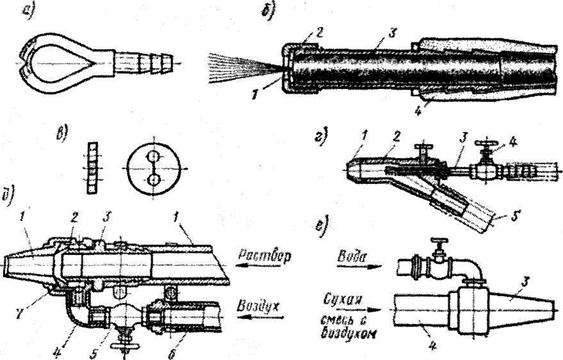 На рис. 12, 8 е приводится сопло для нанесения торкрет-штукатурки. В сопло подается не раствор, а сухая смесь с воздухом и через другое отверстие подводится вода. В этой конструкции регулируется только расход воздуха при помощи крана.