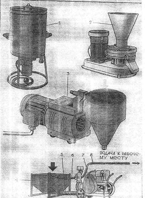Кусковый мел, смоченный водой, в роторной мелотерке перерабатывается в меловую пасту. Меловая паста вместе с клеевым раствором (из клееварки) поступает в жерновую краскотерку. Отсюда приготовленная клеевая шпатлевка поступает в малярный агрегат, где, процеживаясь через вибросито, поступает в бункер винтового насоса и по резинотканевому рукаву подается к рабочему месту маляра. При нанесении шпатлевки агрегат работает совместно с компрессором СО-7Б. Давление, создаваемое винтовым насосом (2 МПа), обеспечивает дальность подачи смеси по вертикали 40, по горизонтали 80м.