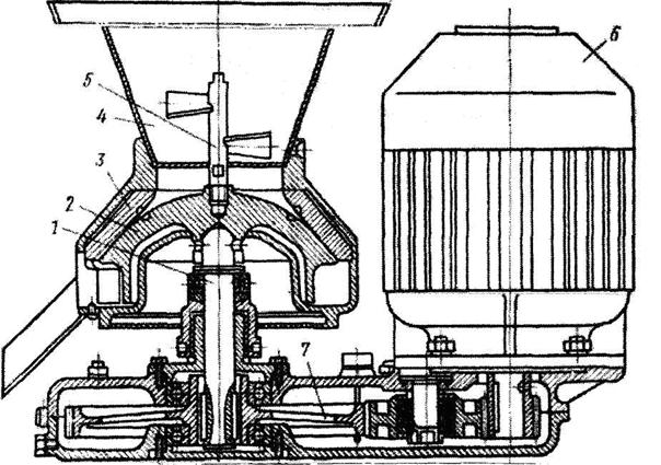 1 - вал; 2, 3 - жернова; 4 - бункер;