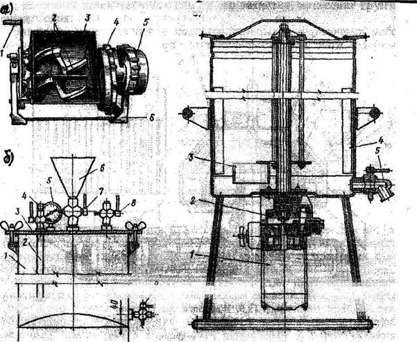 а - двухвальный; 1 - рукоятка механизма выгрузки смеси; 2 -смесительные валы; 3 - корыто; 4 - редуктор; 5 - электродвигатель; 6 -станина; б - пневмоэмульсатор; в - лопасной.