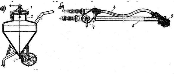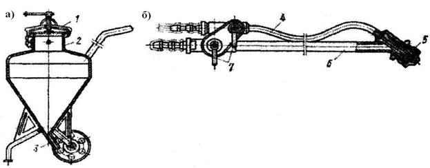 На рис. 12.17 показан аппарат для нанесения шпаклевки. Он состоит из бака 2 на двух колесах с герметической крышкой 1 и поручнем 3. На крышке установлены предохранительный клапан и манометр. Состав заливается в бак сверху через горловину, туда же подается сжатый воздух от компрессора через трехходовой кран. В нижней части бака имеется штуцер, к которому присоединяется шланг для подачи состава к удочке. Удочка (рис. 12.17 б) состоит из двух трубок 4 и 6, через одну из них подается состав, а через другую сжатый воздух. Количество того и другого регулируется кранами 7, а скорость истечения, т. е. факел, насадкой 5.
