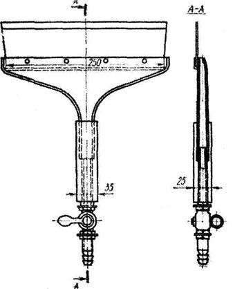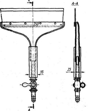 Шпатель (рис. 12.19 ) представляет собой трубку, на нижнем конце которой имеется пробковый кран и штуцер, через который на поверхность подается под давлением шпаклевка; на верхнем конце закреплена полоса резины для разравнивания слоя шпаклевки по поверхности.