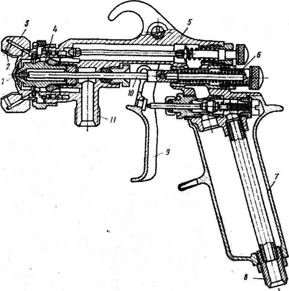 Пистолет-краскораспылитель показан на рис. 12.20. Он состоит из корпуса 5, распылительной головки 3, запорной иглы 10, нажимной скобы 9, рукоятки 7. К штуцеру 8 присоединяется шланг для подачи сжатого воздуха, к штуцеру 11 —шланг для подачи состава. Распылительная головка имеет одно центральное отверстие 1 и несколько боковых отверстий 2, в зависимости от числа которых получается различная форма факела. Запорная игла 10 под действием пружины 6 перекрывает форсунку 4 и воздушный канал 1. Окрасочные составы подаются к пистолетам-распылителям из съемных бачков или из красконагнетательных баков.