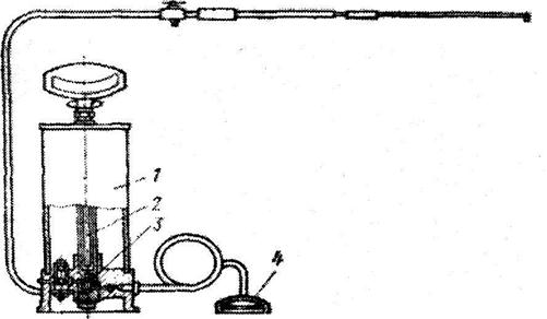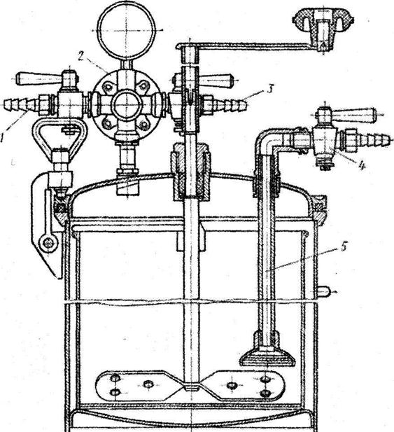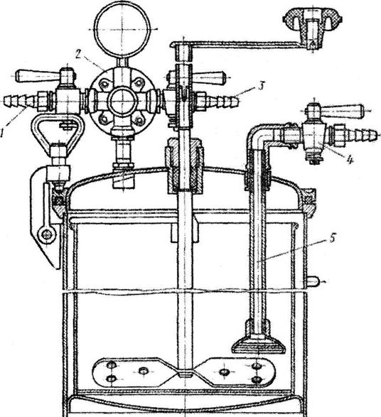 Красконагнетательный бак (рис. 12.21) состоит из корпуса с герметической крышкой и помещенного внутри него ведра, в котором находится мешалка и трубка с фильтром. Сжатый воздух поступает через кран 1. Часть воздуха, не проходя через редуктор, поступает через кран 3 к пистолету-краскораспылителю. Другая часть сжатого воздуха проходит через редуктор 2 и после снижения давления до нужной величины поступает в бак, вытесняя налитый в ведро состав, который