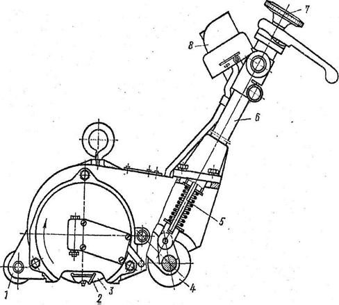 Машина для строгания паркетных полов показана на рис, 12.28. Рабочим органом служит ножевой барабан 3, на котором закреплены ножи 2 (обычно два). Барабан является одновременно обращенным ротором электродвигателя. Статор электродвигателя установлен на валу, закрепленном в боковых крышках корпуса. Кроме ножей на барабане закреплена крыльчатка — вентилятор для отбрасывания стружки в сторону. Ходовая часть машины состоит из одного переднего 1 и двух задних роликов 4. Регулирование толщины снимаемой стружки осуществляется поднятием или опусканием оси ротора при помощи тяги 5, перемещаемой гайкой 7.