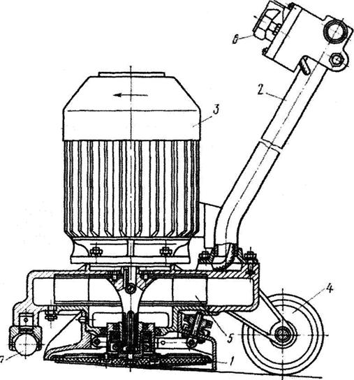 Паркетошлифовальная машина (рис. 12.29) имеет рабочий орган в виде фибрового шлифовального диска 1 диаметром 200—250 мм, установленного под углом Зр к обрабатываемой поверхности. Такое положение диска предохраняет его от перегрева и обеспечивает лучший отсос пыли вентилятором 5. Диск приводится во вращение электродвигателем 3. Ходовая часть состоит из одного переднего ролика 7, который может свободно поворачиваться, и двух задних роликов 4. На рукоятке 2 установлен выключатель 1.