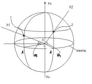 Плоскости меридианов, проходящие через точки 1 и 2, образуют двугранный угол