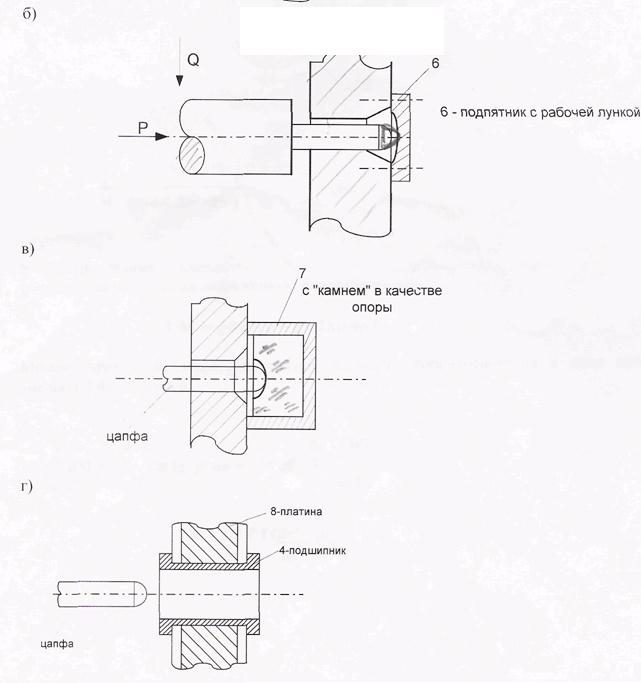Для уменьшения момента сил трения при действии осевых сил конец цапфы, упирающийся в подпятник, делают сферической формы. Цапфа и внутренний диаметр отверстия камниевой втулки должны иметь строго цилиндрическую форму и тщательно, отшлифованы так, чтобы чистота поверхности соответствовала 12