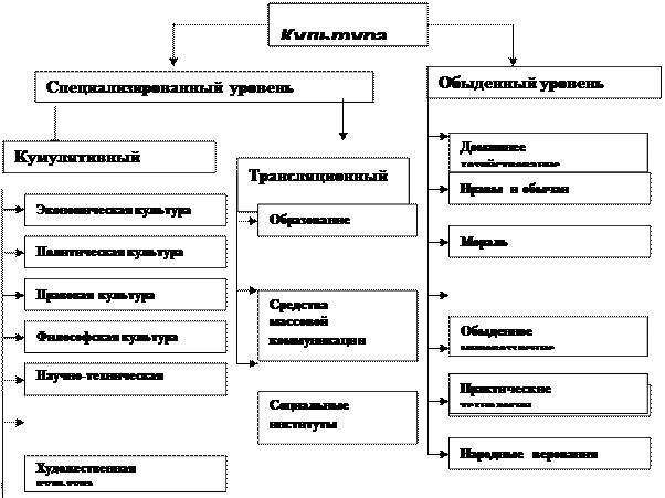 Специализированный уровень подразделяется на кумулятивный и трансляционный. На кумулятивном уровне сосредоточивается, накапливается профессиональный социокультурный опыт, аккумулируются ценности социума. На этом уровне культура выступает как взаимосвязь элементов, каждый из которых есть следствие предрасположенности человека к определенной деятельности: хозяйственной, политической, правовой, философской, религиозной, научно-технической, художественной. Каждому из элементов кумулятивного уровня соответствует элемент культуры обыденного уровня. Экономической культуре соответствует домашнее хозяйствование, политической – нравы и обычаи, правовой – мораль, философии – обыденное мировоззрение, религии – суеверия и предрассудки, народные верования, научно-технической – практические технологии, художественной культуре – обыденная эстетика.