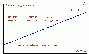 На рис. 7.1А показана некая гипотетическая линия фондового рынка. Государственные облигации разных стран будут располагаться на ней в соответствии с кредитными рейтингами (чем ниже рейтинг, тем выше риск). Локальные индексы рынков акций – примерно в том же порядке, но правее государственных облигаций тех же стран. Условно плоскость «ожидаемая доходность – риск» можно разделить на три участка – низкого, среднего и высокого риска. Положение индивидуального актива относительно ЛФР может изменяться вследствие воздействия трех факторов: