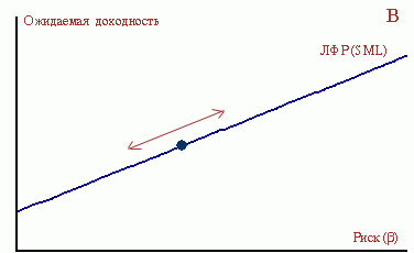 Точки, соответствующие индивидуальным активам, могут располагаться по всей плоскости – ЛФР показывает только «справедливое» для данного момента времени соотношение риска к доходности. Поэтому точки на ЛФР являются целевыми, т.е. точки, обозначающие отдельные активы, в своем блуждании по плоскости «доходность – риск» стремятся к ЛФР. Но процесс схождения к ЛФР затрудняется тем, что положение самой ЛФР на плоскости меняется со временем. Выше ЛФР находятся недооцененные активы (при одном и том же риске ожидаемая доходность выше равновесной), ниже – переоцененные. Продавая активы, располагающиеся ниже ЛФР, и покупая расположенные выше, можно надеяться получить доход.