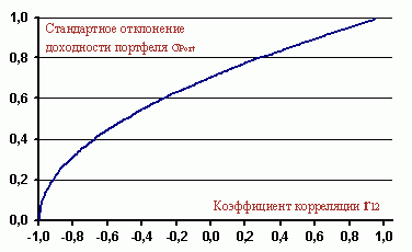 Рис. 7.4. Зависимость стандартного отклонения доходности портфеля из двух активов от коэффициента корреляции [при W1 = σ2 / (σ1 σ2)]