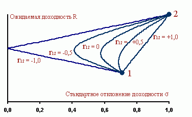 На графике видно, что не только для отрицательных, но и для низких положительных корреляций существуют портфели, риск которых меньше, чем риск каждого из входящих в них активов. В самом деле уже для r12 = +0,5 при некоторых соотношений весов стандартное отклонение портфеля меньше, чем стандартное отклонение любого из активов. Добавляя к активу 1 некоторую долю актива 2 (с большей доходностью и более высоким риском) можно одновременно увеличить доходность портфеля и снизить его риск.