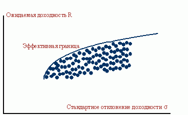 Рис. 7.6. Эффективная граница как огибающая множества рискованных портфелей