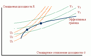 Кривые с индексом 1 пересекают эффективную границу в двух точках, стало быть, каждому инвестору можно сформировать два портфеля, субъективно равноценных – больший риск второго портфеля будет полностью компенсироваться большей доходностью. Однако более высокую полезность (или удовлетворенность) каждый инвестор может осуществить при некоем среднем портфеле, а именно там, где функция полезности касается эффективной границы (кривые с индексом 2) – такая точка только одна для каждого инвестора (характеризуемого своей функцией полезности). Еще большую удовлетворенность инвесторы чувствовали бы на кривых с индексом 3, но увы – они не пересекаются с эффективной границей, и портфелей с такой «полезностью» сформировать нельзя. Следовательно, оптимальным портфелем будет тот, для которого функция полезности касается эффективной границы – он одновременно является и эффективным, и наиболее «полезным» для данного инвестора.