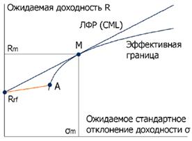 Очевидно, с учетом безрискового актива новой эффективной границей становится прямая RrfM (рис. 7.9), лежащая выше старой эффективной границы (для портфелей рискованных активов) везде, за исключением точки касания М. Эта прямая именуется линией рынка капитала, сокращенно ЛРК (CML – capital market line). Все инвесторы будут выбирать портфели именно на этой прямой, в соответствии с индивидуальной функцией полезности (в точке касания функции полезности и ЛРК). Портфели для разных инвесторов (с разным риском) будут при этом отличаться только долей безрискового актива.