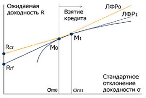 В реальной жизни, разумеется, ставка кредитования выше безрисковой (часто намного выше), и ЛРК становится ломаной линией (рис. 7.10) – она состоит из отрезков ЛРК0 и ЛРК1. ЛРК1 строится исходя из точки Rcr (ставка кредитования) и касается эффективной границы не в «старой» точке М0, а правее и выше, в точке М1. Точка М «раздваивается» – для инвесторов, использующих кредитные средства, рыночный портфель должен быть несколько более рискованным, но обычно различиями пренебрегают. Пренебрегают и тем, что между точками М0 и М1 портфель должен выбираться на «старой» эффективной границе рискованных активов, и понятно, почему – касательная здесь проходит очень близко к эффективной границе, да и обычно если уж берут в долг, то много.