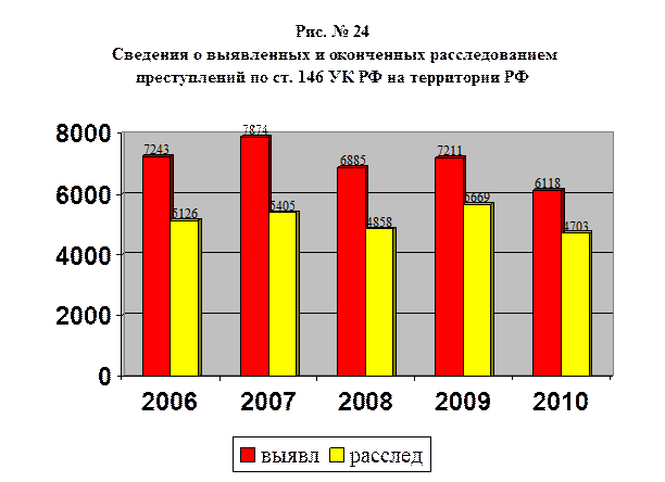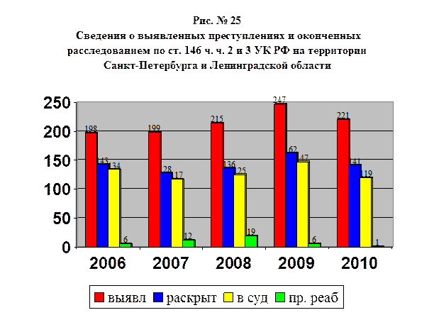 Данные о выявленных и оконченных расследованием преступлений, предусмотренных ст. 146 УК РФ за 2006-2010 гг. на территории Российской Федерации и соответствующие данные по Санкт-Петербургу и Ленинградской области, исходя из назначения данного издания, изложим на рисунках №№ 24, 25, с целью большей информативности при восприятии указанных данных.