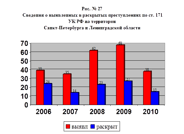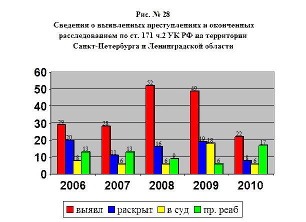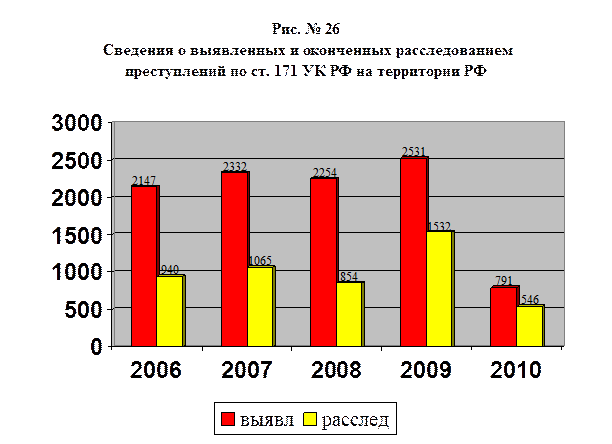 Данные о выявленных и оконченных расследованием преступлений, предусмотренных ст. 171 УК РФ за 2006-2010 гг. на территории Российской Федерации и соответствующие данные по Санкт-Петербургу и Ленинградской области, исходя из назначения данного издания, изложим на рисунках №№ 26-28, с целью большей информативности при восприятии указанных данных.