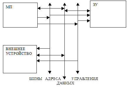 Рассмотренные методы предназначены для обмена данными между микропроцессором и внешними устройствами. Для обмена данными между внешними устройствами и памятью нет необходимости пересылать данные через микропроцессор, так как это займет ресурсы микропроцессора и время. Можно ввести в систему контроллер прямого доступа в память, который выполняет указанные функции обмена. Проблема использования контроллера прямого доступа в память заключается в том, то внешнее устройство должно обмениваться данными с памятью, используя уже имеющиеся информационные шины (шина адреса, данных, управления). Задача разделения единого информационного канала между микропроцессором и каналом прямого доступа в память решается путем использования свойств трехуровневого состояния информационных магтстралей. На рисунке показано подключение микропроцессора, памяти и внешнего устройства к шинам при обычном режиме.