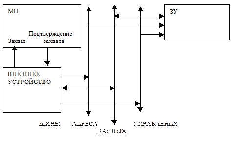 В этом режиме состояние информационных магистралей может иметь два уровня: нулевое и единичное. В режиме прямого доступа в память внешнее устройство берет на себя функции по управлению обменом информацией с памятью, а выводы микропроцессора, подключенные к шинам должны быть переведены в третье состояние. Третье состояние – это состояние высокого сопротивления (высокоимпедансное состояние), что означает отключение от шины. Для реализации этого внешнее устройство посылает сигнал захват шин на специальный вывод микропроцессора, в ответ на этот сигнал микропроцессор посылает сигнал подтвержление захвата и переводит свои выводы в третье состояние. Режим захвата шин для микропроцессора продолжается до тех пор пока внешнее устройство работает с памятью и пока им не будет снят сигнал захвата шин. В этом режиме состояние микропроцессора “замораживается” без каких-либо изменений. Режим иллюстрируется рисунком.