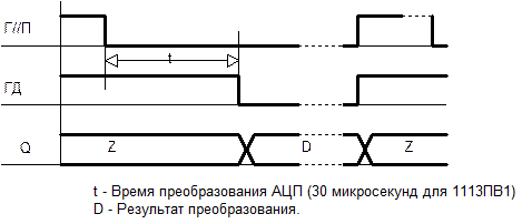 Сигналом запуска по входу Г//П (гашение и преобразование) запускается цикл преобразования АЦП, по окончании которого на выходах Q АЦП появляется код, соответствующий напряжению на входе U(АС) АЦП, а на выходе ГД (готовность данных) АЦП устанавливается низкий логический уровень, означающий готовность данных на выходе АЦП и вызывающий прерывание микроЭВМ по входу /INT. В подпрограмме обработки этого прерывания микроЭВМ вводит код с выходов АЦП через порт P0. Временная диаграмма, поясняющая принцип работы микроЭВМ и АЦП.