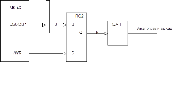Используем возможность работы микроЭВМ с внешней памятью данных. Можно представить ЦАП как ячейку внешней памяти данных, в которую для формирования аналогового сигнала нужно уметь записывать байт данных, так как это делается при записи данных во внешнюю память. Известно, что по команде MOVX @Ri, A происходит пересылка содержимого аккумулятора во внешнюю память данных, адрес которой находится в регистре Ri. При этом на шину DB сначала выводится адрес ячейки внешней памяти данных и фиксируется по сигналу ALE во внешнем регистре, выходы которого должны быть подключены к адресным входам ОЗУ. Этот адрес необходимо использовать, если количество подключаемых устройств больше одного. Но в нашем случае используется один ЦАП, его адресации не требуется, поэтому внешний регистр адреса не используется. Далее по алгоритму выполнения команды MOVX @Ri, A на шину DB помещаются данные и формируется сигнал /WR –запись. Необходимо зафиксировать эти данные в каком-то внешнем регистре по сигналу /WR и с выхода этого регистра подать на вход ЦАП. Тогда схема, реализующая подключение ЦАП будет иметь вид.