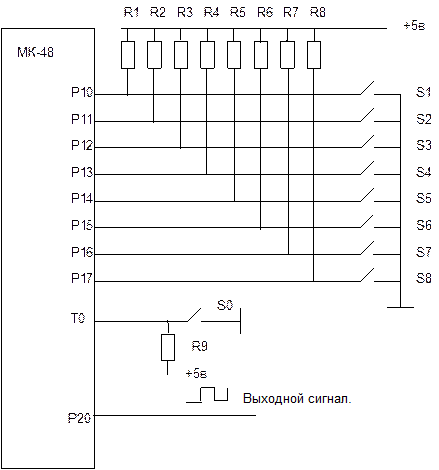 Используем микроЭВМ с внутренней памятью данных. Для связи с пультом управления в нашем распоряжении все порты микроЭВМ и входы тестирования T0 и T1. Для вывода импульсной последовательности можно использовать любую линию любого порта микроЭВМ. Пусть это будет вывод P20. Для включения/выключения генератора имеется кнопка S0 с фиксацией. Если она нажата, на выходе P20 имеется импульсная последовательность, если отжата - на выходе имеется логический 0. Для задания периода генерируемой импульсной последовательности имеются кнопки S1-S8, сигнал с которых нужно подать на один из портов микроЭВМ. Пусть это будет порт P1.