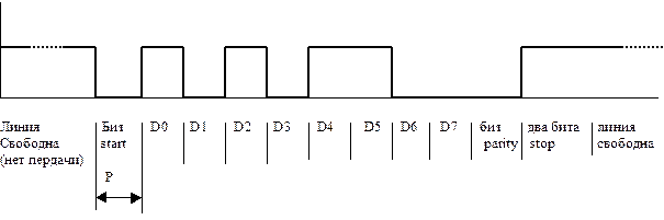 | Бит старт | D1 | D2 | D3 | D4 | D5 | D6 | D7 | D8 | Бит четности | Бит стоп | Бит стоп |
