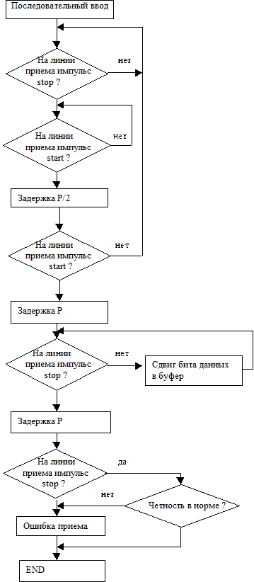В начале выполнения программы биты принимаемых данных регистрируются без интервалов (один за другим), пока на линии не появится бит stop. Далее начинается непосредственно прием байта. Схема приема ожидает появления бита start. Цель алгоритма заключается в возможно более точном обнаружении переднего фронта бита start. Этот момент времени будет использован как точка отсчета для регистрации всех последующих битов символа. После обнаружения переднего фронта бита start устанавливается задержка в течение половины длительности приема одного бита. Если на линии еще присутствует бит start, то он считается действительным и устанавливается временная задержка, равная Р. По окончании задержки Р обрабатывается первый бит данных и устанавливается новая задержка. Этот процесс повторяется до тех пор, пока не будут зарегистрированы все 8 бит данных и бит четности. Два последних принятых бита необходимо проверить, являются ли они битами stop. Если проверка подтверждает биты stop и проверка на четность дает положительный результат считается, что символ достоверен, если нет, - произошла ошибка приема.